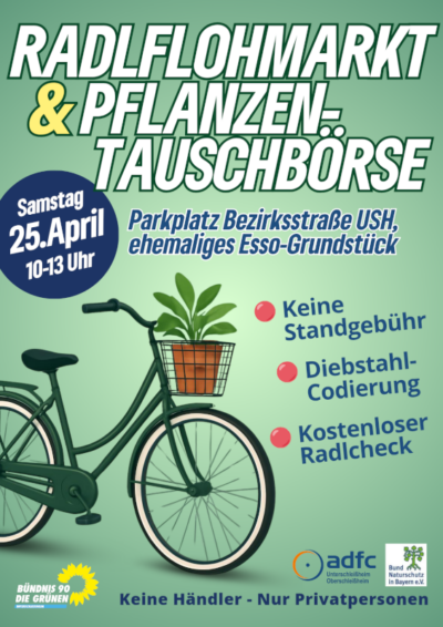 Auch in diesem Jahr gibt es wieder einen Radlflohmarkt von Bündnis 90/Die Grünen in Unterschleißheim. Er wird ergänzt durch ein Angebot des ADFC für einen kostenlosen Radlcheck und die Codierung von Fahrrädern. Mit dabei ist auch wieder die Ortsgruppe Schleißheim des BUND Naturschutz, die eine Pflanzentauschbörse anbietet.